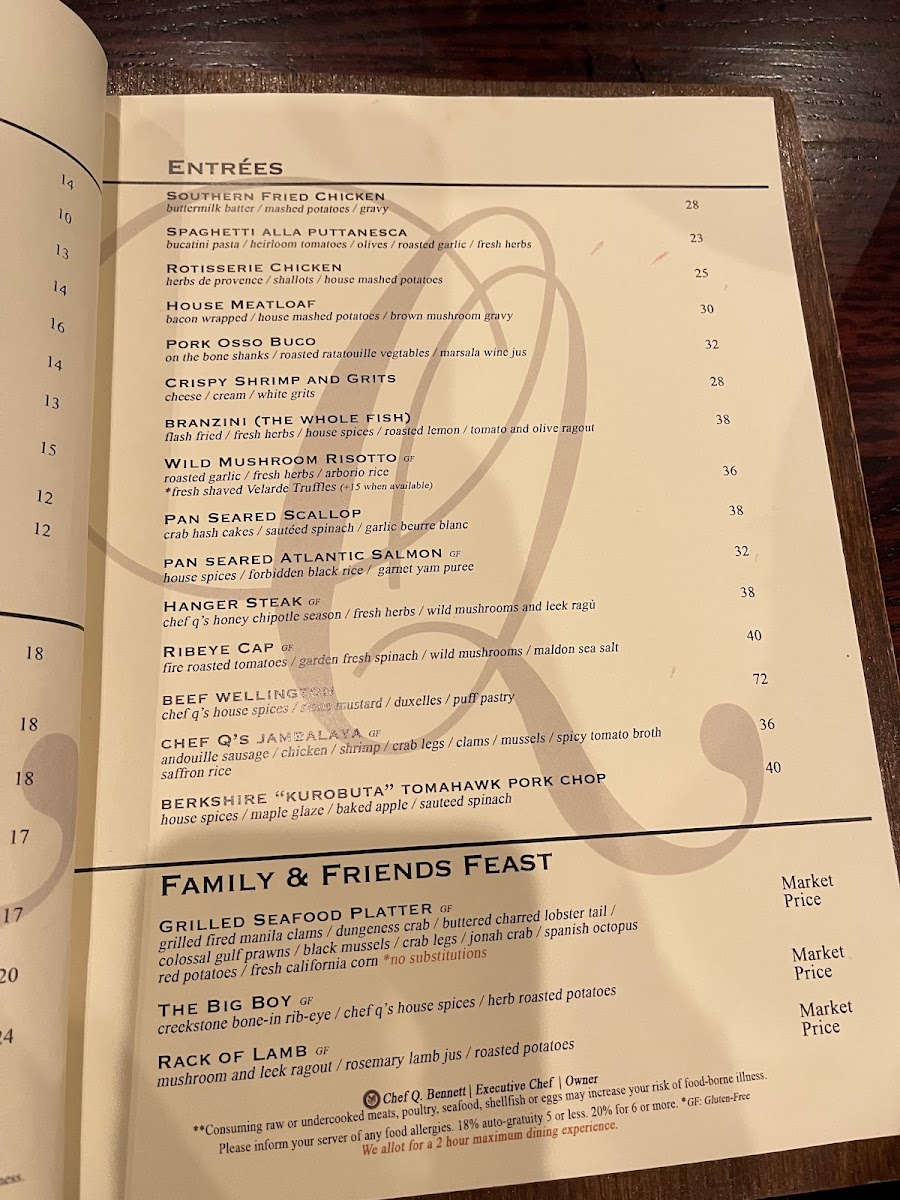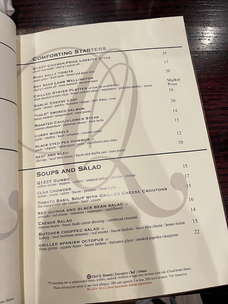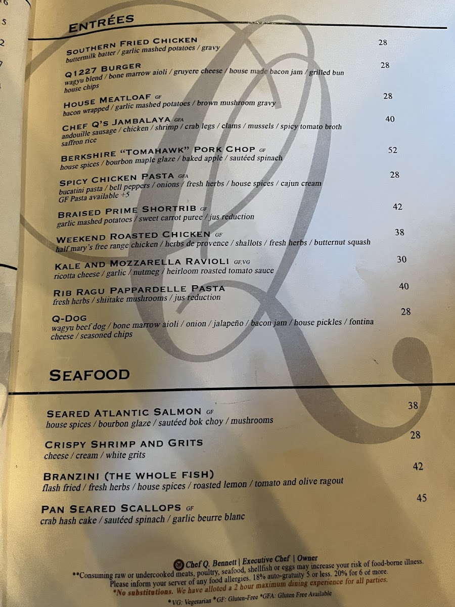 The wife and I had an excellent night out at Chef Q 1227. For starters we had the lobster bite and the garlic cheese loaf I highly recommend you try these appetizers. The garlic cheese loaf is definitely a must and is probably enough to feed or individuals. The wife and I end up taking some home. The lobster bites for enough for at least two people. The atmosphere was lively but not overwhelming. The live jazz music at the time we went was a plus it really made our evening. The main course for us was the ribeye cap and the tomahawk pork chop Berkshire. All the sauces were wonderful we really enjoyed the house sauce for the lobster bites. Although the restaurant had a full bar the wife and I enjoyed mocktails I recommend a watermelon and cucumber mocktail. Where did ended up taking the dessert home. Flourless chocolate cake and raspberry key lime cheesecake. I recommend making a reservation and to arrive with a healthy appetite. Chef Q and his staff did an amazing job and made our evening very special. They even sent a than you email for our patronage. We definitely will be coming back there soon. Thanks Chef Q.