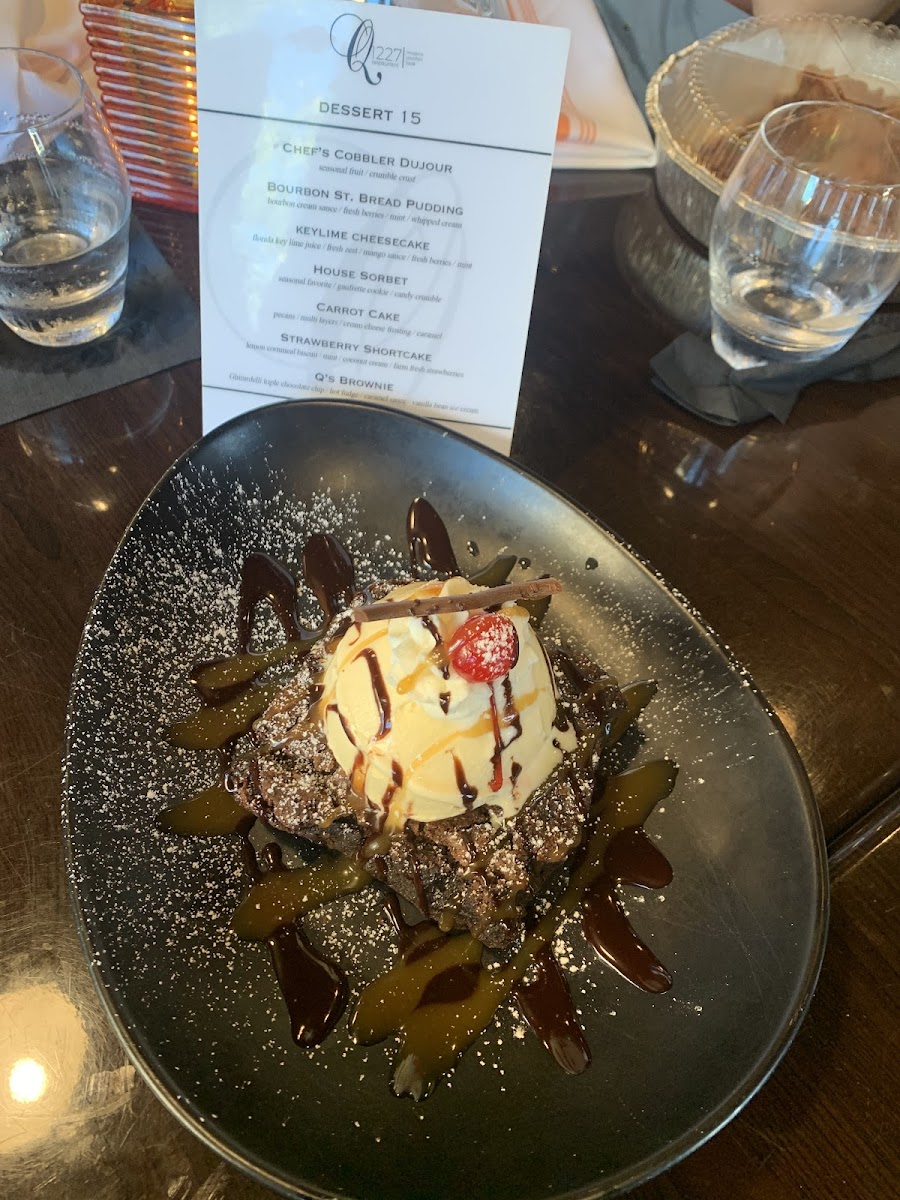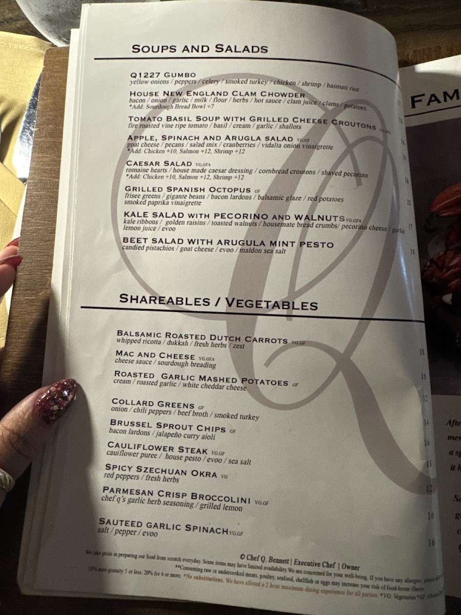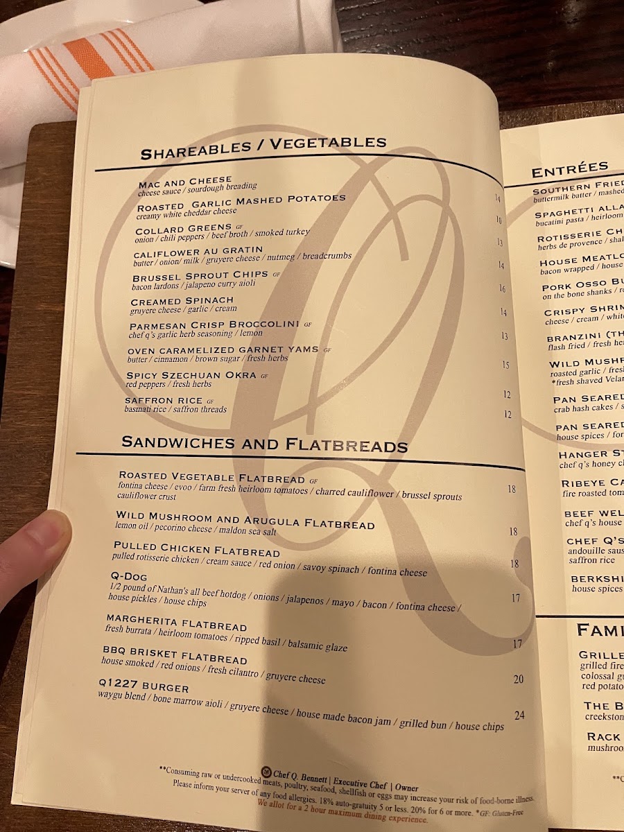 The wife and I had an excellent night out at Chef Q 1227. For starters we had the lobster bite and the garlic cheese loaf I highly recommend you try these appetizers. The garlic cheese loaf is definitely a must and is probably enough to feed or individuals. The wife and I end up taking some home. The lobster bites for enough for at least two people. The atmosphere was lively but not overwhelming. The live jazz music at the time we went was a plus it really made our evening. The main course for us was the ribeye cap and the tomahawk pork chop Berkshire. All the sauces were wonderful we really enjoyed the house sauce for the lobster bites. Although the restaurant had a full bar the wife and I enjoyed mocktails I recommend a watermelon and cucumber mocktail. Where did ended up taking the dessert home. Flourless chocolate cake and raspberry key lime cheesecake. I recommend making a reservation and to arrive with a healthy appetite. Chef Q and his staff did an amazing job and made our evening very special. They even sent a than you email for our patronage. We definitely will be coming back there soon. Thanks Chef Q.